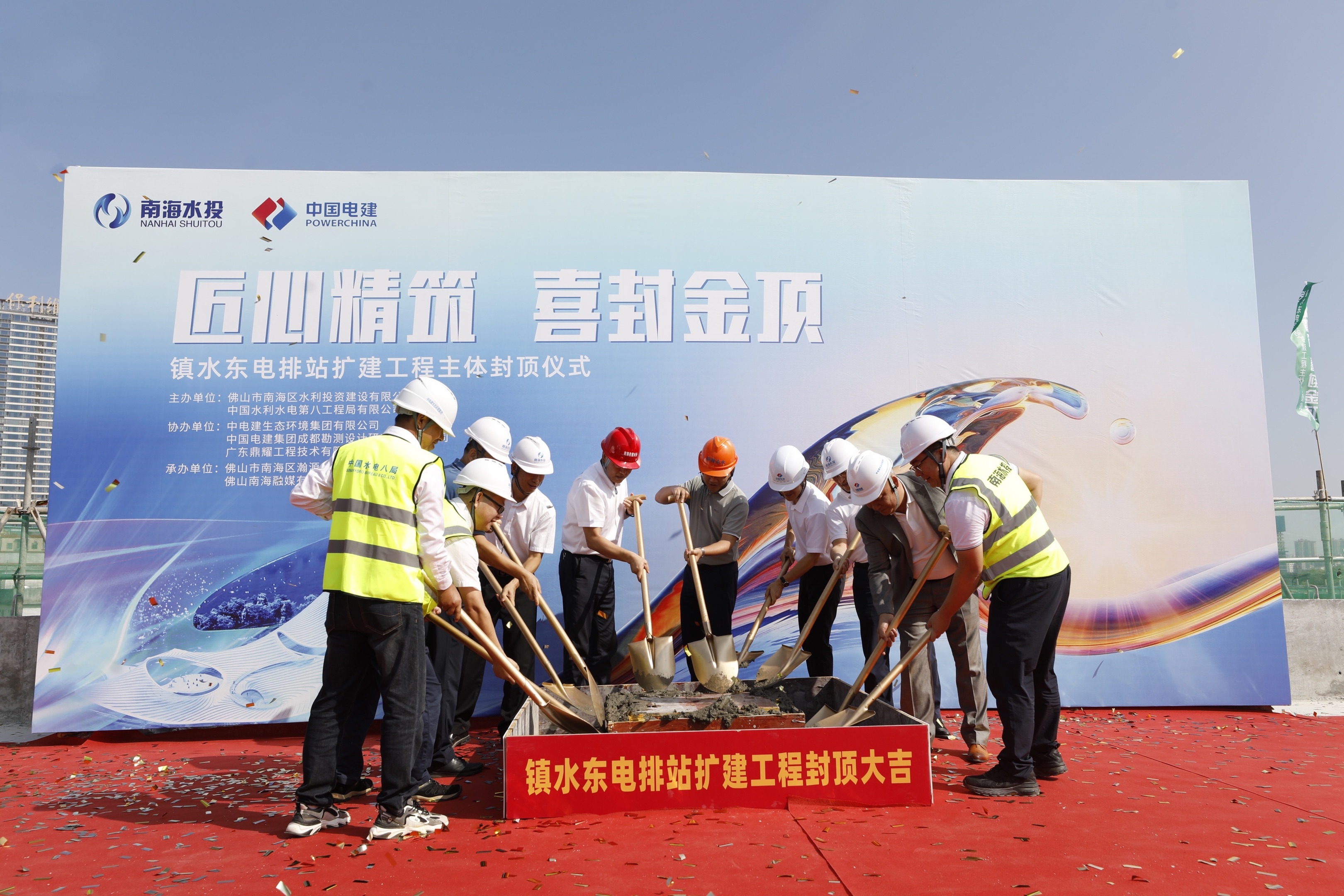 11月12日,水電八局承建的佛山北村鎮(zhèn)水東電排站擴(kuò)建工程主廠房及值班室成功封頂。南海區(qū)委辦、區(qū)住建水務(wù)局、區(qū)國資局、區(qū)委宣傳部、大瀝鎮(zhèn)河長辦,大瀝鎮(zhèn)水利所、南海區(qū)水投公司、廣東廣播電視臺(tái)及參建各方參與封頂儀式。 鎮(zhèn)水東電排站擴(kuò)建工程位于佛山市南海區(qū)大瀝鎮(zhèn)岳利沙村南側(cè),本工程的建設(shè)任務(wù)以片區(qū)排澇為主,兼顧片區(qū)河涌生態(tài)補(bǔ)水。為滿足片區(qū)遠(yuǎn)期規(guī)劃30年一遇24小時(shí)設(shè)計(jì)暴雨1天排干不致災(zāi)的排澇標(biāo)準(zhǔn),計(jì)劃將鎮(zhèn)水東電排站擴(kuò)建10.4立方米每秒,加現(xiàn)有18.6立方米每秒排澇能力,擴(kuò)建完成后總排澇規(guī)模將達(dá)到29立方米每秒。同時(shí)為增強(qiáng)河涌水體流動(dòng)性,改善水頭涌水質(zhì),引入外江佛山水道活水,提水規(guī)模8立方米每秒,根據(jù)機(jī)電設(shè)備選型實(shí)際安裝3臺(tái)1200ZLB- 125型立式軸流泵,總裝機(jī)容量675千瓦。 工程主要建筑物包括內(nèi)引涌段、清污機(jī)段、進(jìn)水前池段、進(jìn)水閘室段、廠房段、出水閘室段、出水箱涵段、出口消力池段、海漫段、主廠房及管理用房等。由于地質(zhì)原因建設(shè)過程中面臨樁基施工無法成孔、過江隧道規(guī)劃沖突等一系列難題,項(xiàng)目部積極與南海區(qū)各單位進(jìn)行溝通協(xié)調(diào),落實(shí)“清單化管理,責(zé)任化推進(jìn)”,做好月度任務(wù)分解,明確時(shí)間表,倒排工期,掛圖作戰(zhàn),集中力量攻堅(jiān)化解,各項(xiàng)問題逐一得到解決,確保了建設(shè)任務(wù)的順利完成。 此次封頂意味著項(xiàng)目建設(shè)邁出了關(guān)鍵的一步,取得了階段性的勝利。后續(xù),項(xiàng)目部將繼續(xù)秉持安全、優(yōu)質(zhì)、高效的建設(shè)理念,全力以赴完成后續(xù)施工任務(wù)。